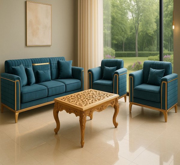Elevate your living space with the STATA Verona Elegance — a luxurious 3-2-1 sofa set crafted for both style and comfort. Upholstered in rich, velvety teal fabric with tasteful golden accents, this set effortlessly blends modern sophistication with timeless charm. The set includes a spacious 3-seater, a cozy 2-seater, and a stylish single-seater, perfect for any home or hospitality space.